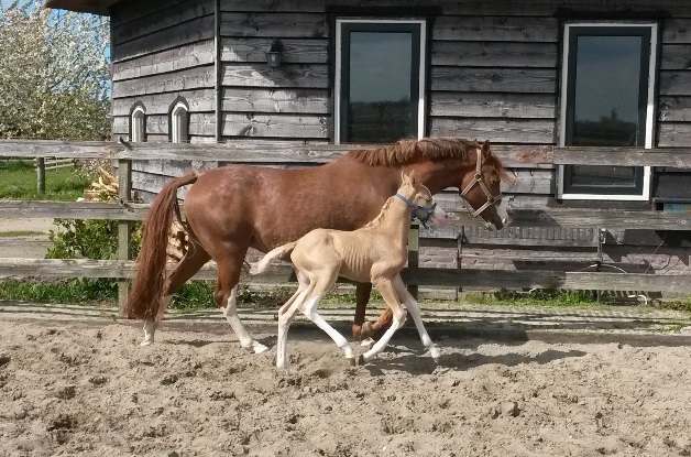 Op 26 april is Verana bevallen van een prachtig palomino hengstveulen van de hengst Le Matsjo. Een veulen met goede bewegingen en een heel mooi exterieur. Het is absoluut een kopie van zijn volle broer Legreaux, welke in 2014 als sportpony naar Frankrijk verkocht is.